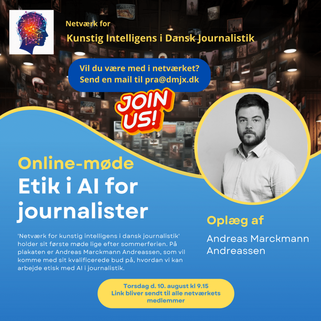 Netværket holder også en række møder med oplæg og diskussioner. Det første møde afholdes online den 10. august med oplæg af journalist Andreas Marckmann Andreassen, der vil fortælle om etikken i AI for journalister.